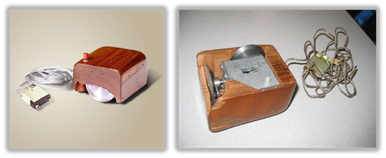 Наиболее распространённый элемент аппаратного управления графическим интерфейсом – компьютерная мышь. Первая мышь появилась в середине шестидесятых годов. Её изобрёл всё тот же Дуглас Энгельбарт. Первая модель мыши имела деревянный корпус и всего одну кнопку. Изменение координат указателя осуществлялось за счёт вращения двух круглых дисков при движении.