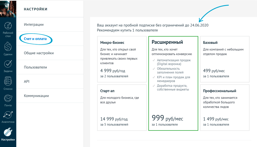Срок окончания тестового периода можно посмотреть в пункте «Настройки» в «Счет и Оплата».