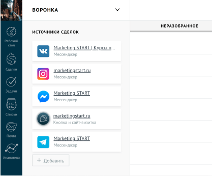 При интеграции с источниками поступления лидов можно указать на какой этап воронки продаж будет попадать лид или отправить лид в “неразобранное”. Для этого нужно перейти в “Сделки”, нажать кнопку “Настроить” и включить активный режим “Неразобранного”.