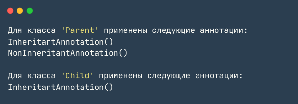 import java.lang.annotation.Annotation; public class Main < public static void main(String[] args) < Parent parent = new Parent(); Child child = new Child(); if(parent.getClass().getAnnotations().length >0) < System.out.println(«Для класса ‘Parent’ применены следующие аннотации: «); for(Annotation annotationName: parent.getClass().getAnnotations()) < System.out.println(annotationName); >> else < System.out.println(«К классу ‘Parent’ не применены какие-либо аннотации.»); >if(child.getClass().getAnnotations().length > 0) < System.out.println(«nДля класса ‘Child’ применены следующие аннотации: «); for(Annotation annotationName: child.getClass().getAnnotations()) < System.out.println(annotationName); >> else < System.out.println(«nК классу ‘Child’ не применены какие-либо аннотации.»); >> >