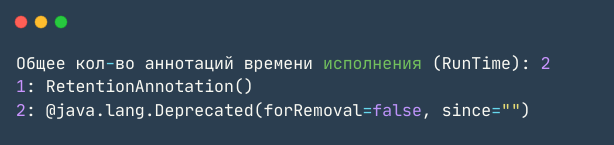 Если мы исправим политику аннотации RetentionAnnotation с RetentionPolicy.RUNTIME на RetentionPolicy.SOURCE (и закомментируем строку в классе Main, выводящую второй элемент массива), то программа отобразит только одну аннотацию deprecated, поскольку аннотация с RetentionPolicy.SOURCE во время компиляции будет удалена.