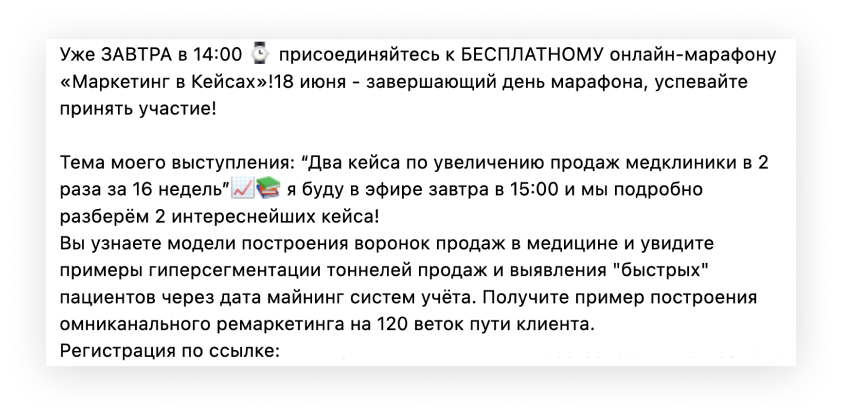 В Инсте и ВК, конечно, тоже не нужно придумывать что-то небывалое про спикера, но тут публика более добрая. Если пишете для Инстаграма, помните о том, что ссылка в посте некликабельная, а в сторис кидать ссылки могут только аккаунты, у которых больше 10 тысяч подписчиков. Поэтому ссылку на регистрацию лучше размещать в шапке профиля, не забыв в посте с анонсом скоординировать людей.