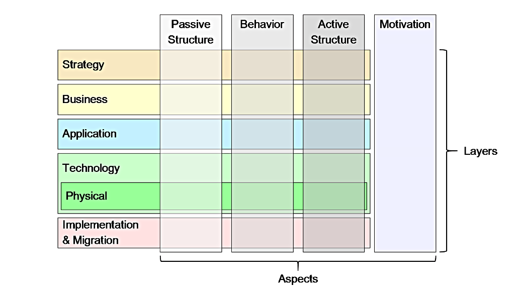 Пример Рассмотрим подробнее первый аспект. Три его элемента можно представить как подлежащее, сказуемое и дополнение: кто делает действия, какие он выполняет действия и каким образом — с помощью каких инструментов. Допустим, на уровне бизнес-слоя есть деятель (Actor), который является аспектом активной структуры (Active structure), выполняемый им процесс — это Behavior, пассивный объект (Passive structure) — это непосредственно концептуальный объект, над которым выполняется действие. К примеру, сотрудник отдела страхования выписывает клиенту страховку. Сотрудник — элемент активной структуры, составление договора о страховании — это процесс, а клиент — элемент пассивной структуры.