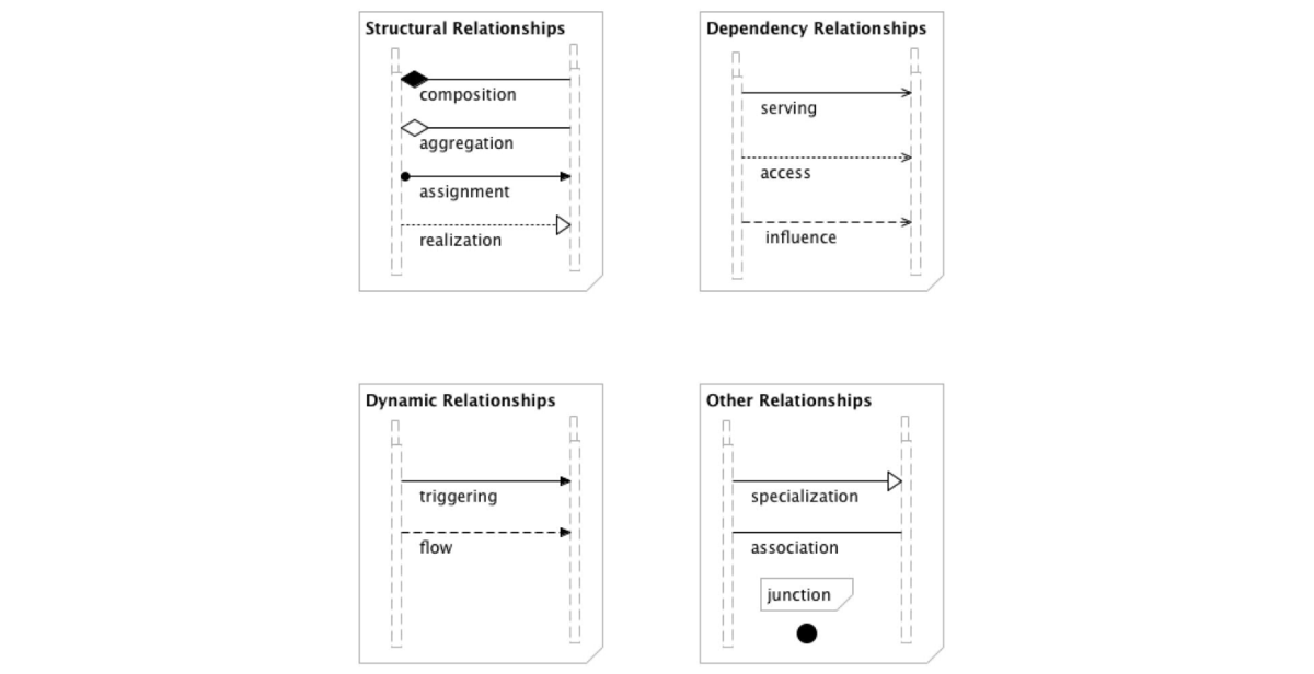 Метамодель в основе языка ArchiMate. Взаимодействие целевой составляющей (Why? What? Strategic view), архитектуры (How?) и составляющей практической реализации (When? By What?) Типизация связей и способ их применения Типы связей важно различать и правильно использовать: это позволит относительно легко оформлять разные типы отчëтов с помощью ПО Archi. Также с помощью Archi можно увидеть, правильно ли были установлены связи между элементами. Это происходит за счëт встроенных валидаций.