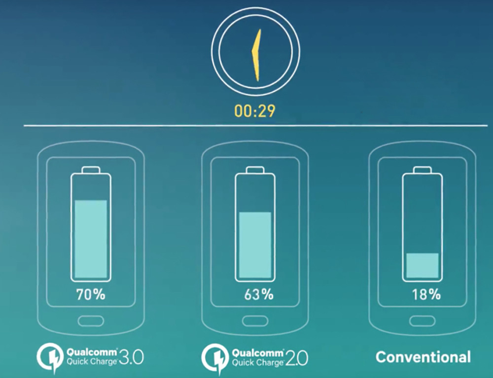 Увы — другая проблема, с USB-C, все еще осталась, так что использовать сторонние кабели для быстрой зарядки через этот порт все еще было рискованно. Что касается скорости зарядки, то компания обещает, что большая часть смартфонов с QC 3.0 зарядится до 70% за полчаса: