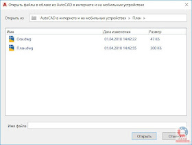 В случае запуска любой из этих команд в AutoCAD открывается окно, в котором отображается содержимое «облачного» хранилища A360, в которое вы можете сохранить файл или открыть файл