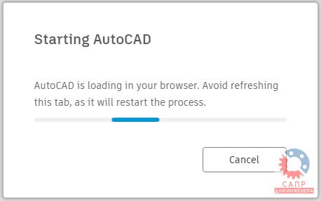 А затем о старте AutoCAD и предупреждение, что обновление страницы приведет к перезапуску всего процесса
