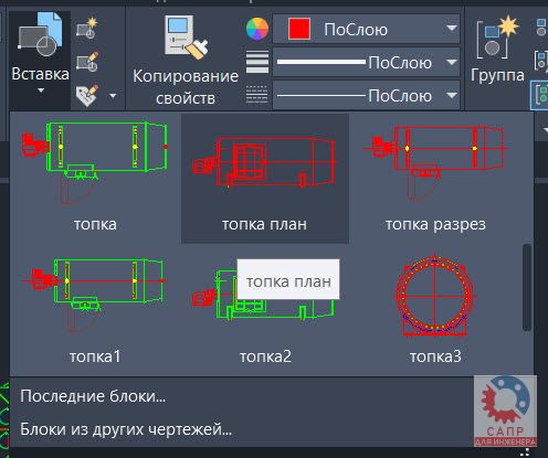 Также можно использовать кнопку Вставить на ленте. При этом все блоки текущего чертежа будут отображаться прямо на ленте, а для перехода к последним вставленным или блокам из другого чертежа необходимо нажать соответствующую кнопку
