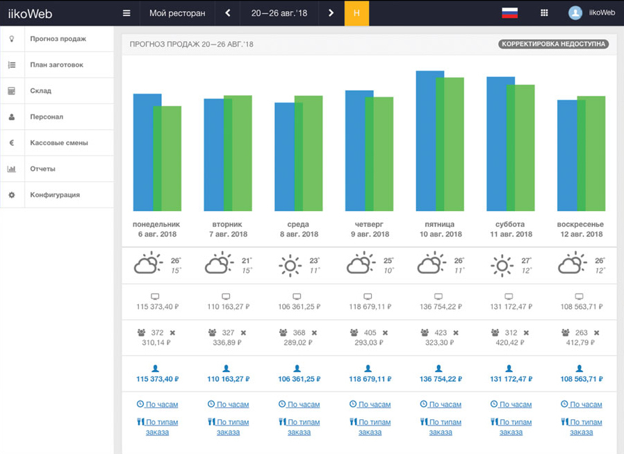 Система автоматически рассчитывает прогноз на три недели вперёд и обновляет его в начале недели. При расчёте она опирается на данные за предыдущие периоды, погодные условия, а также праздники и мероприятия, которые есть в календаре.