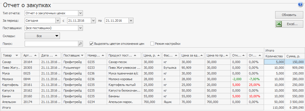 Применяя группу отчётов по закупкам, вы сможете сравнивать закупочные цены на товары поставщиков, отслеживать их изменения и объём закупок. Группа отчёта наглядно покажет отклонение цены товара от цены по прайс-листу. Красным при отклонении в большую сторону, зелёным при отклонении в меньшую.