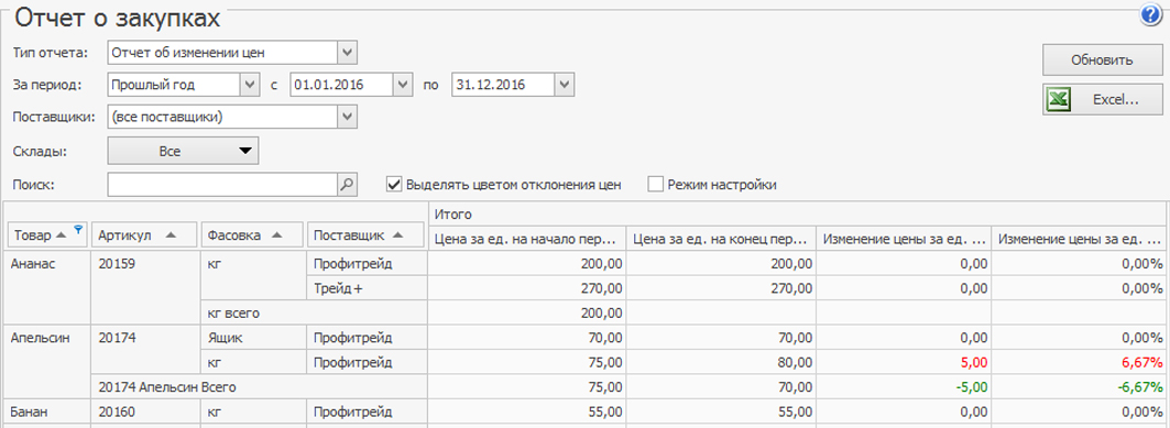 «Отчёт об изменении цен» покажет как изменилась цена за выбранный период.
