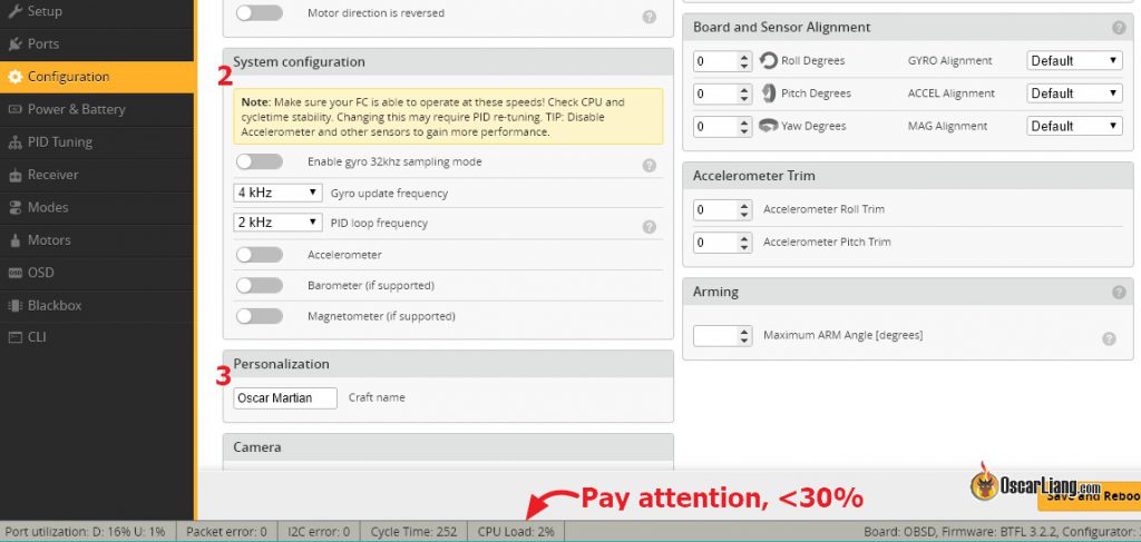 Здесь выбирается частота обновления вычислений гироскопа и цикла PID, чем они больше, тем чище будет лететь квадрокоптер в воздухе, но нужно следить, чтобы у процессора был запас для дополнительной работы, эта строчка показывается в самом низу программы: