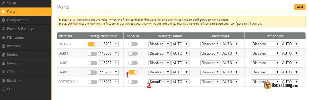 На этой вкладке находятся настройки для UART-портов, то есть, для последовательных портов, которые используются для обмена данными с различными компонентами, такими как приемник, видеопередатчик, GPS-модуль и так далее. USB VCP всегда включен, это тот порт, в который вы вставляете провод, microUSB.