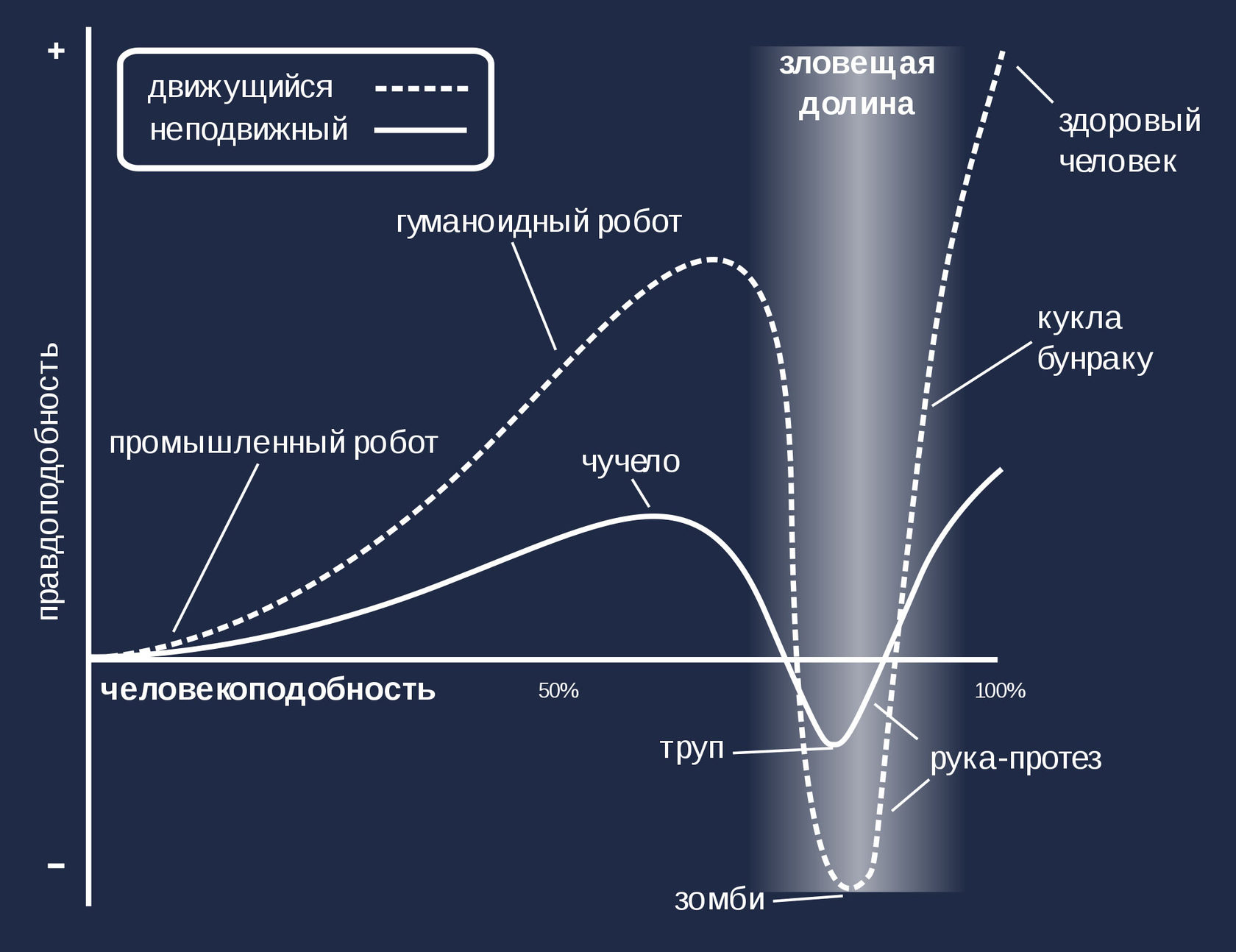 Согласно гипотезе «зловещей долины», подвижные машины с человечески понятным набором качеств должны вызывать у нас чувство отвращения, страха и неприязни. Это происходит в силу того, что они воспринимаются как подделка, чучело.