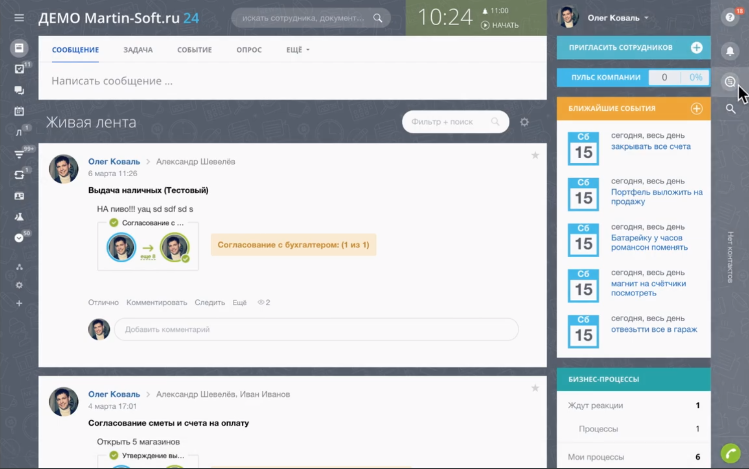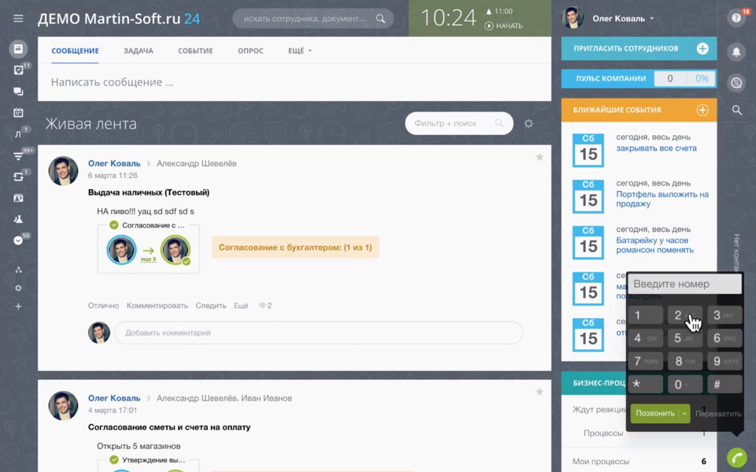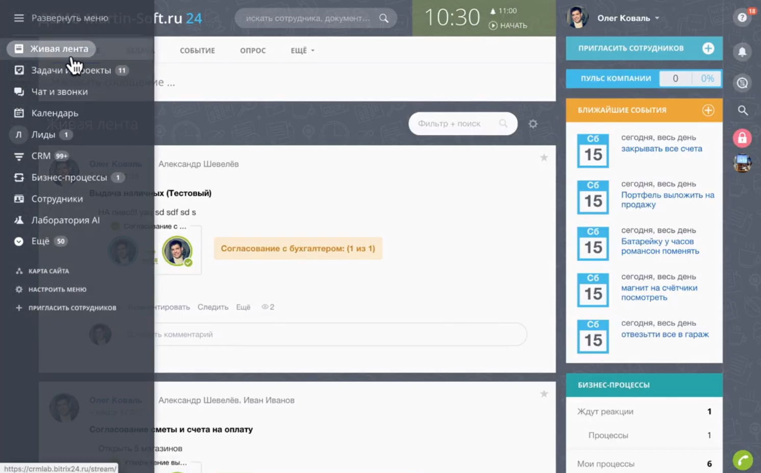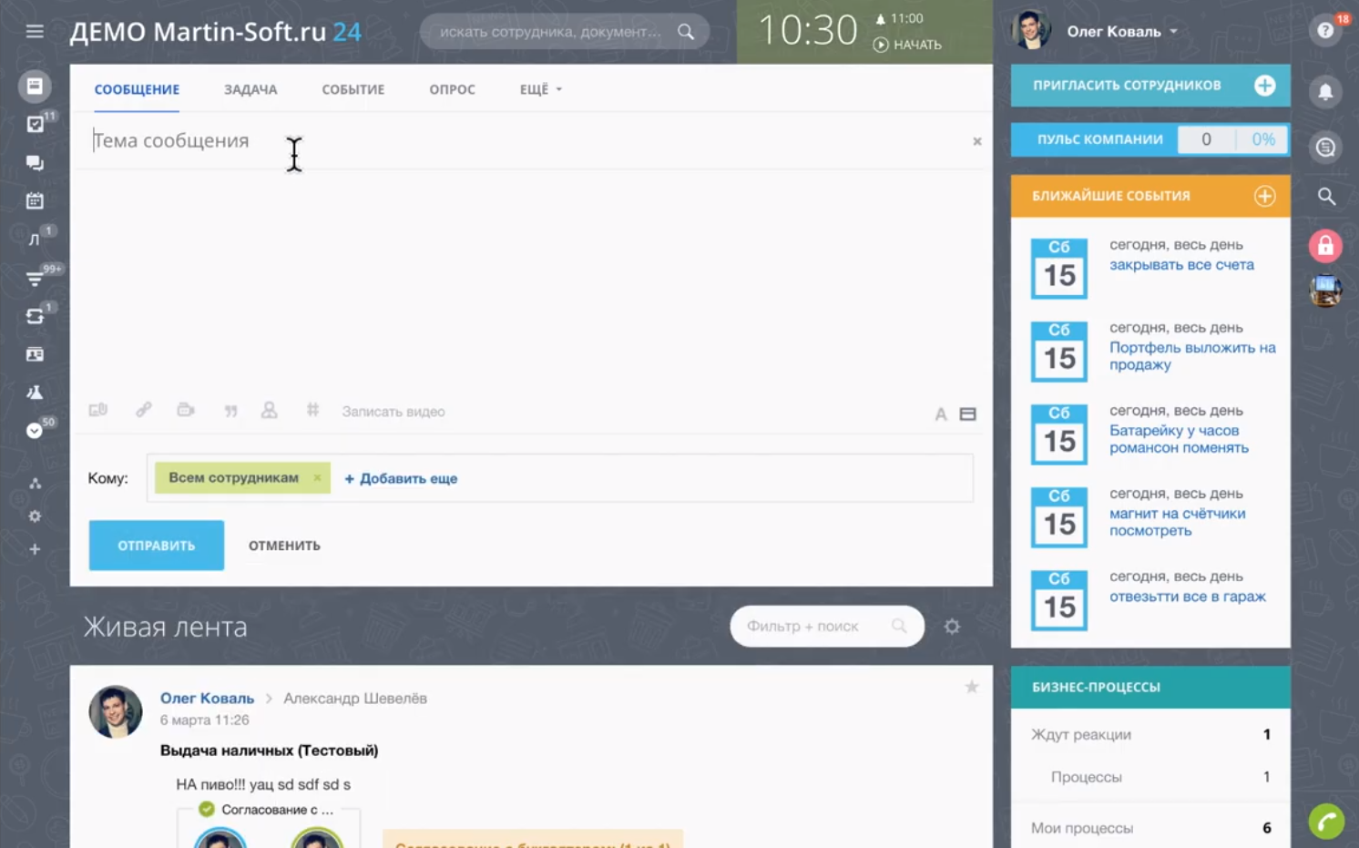 - Живая лента – новостной раздел, где отображаются все текущие задачи вашей компании. Постановка задач и их обсуждение происходит в режиме реального времени.