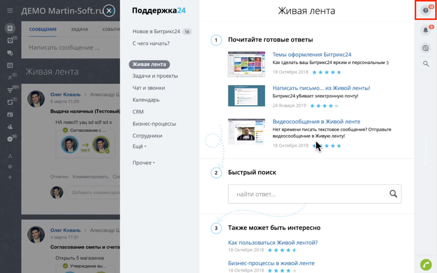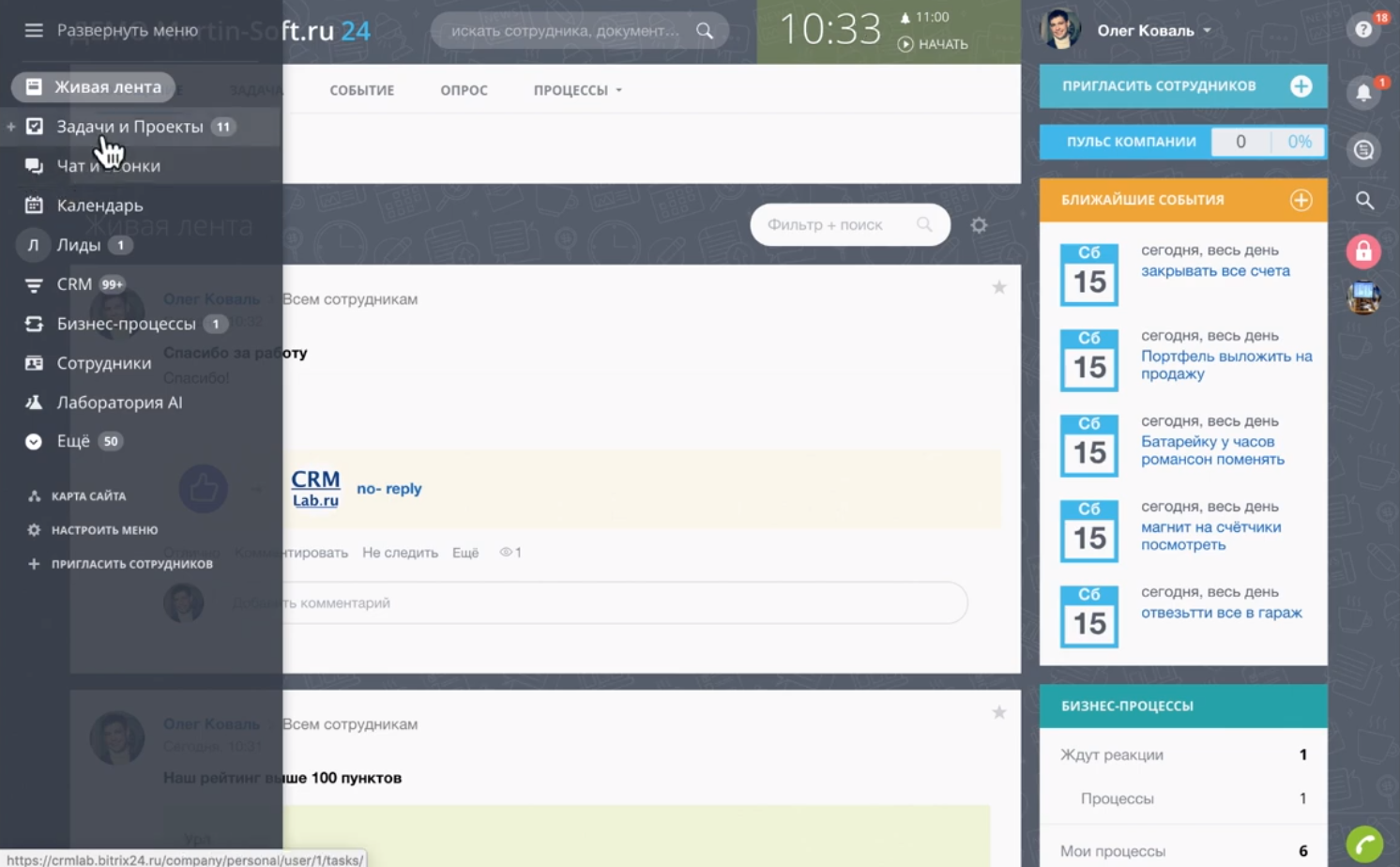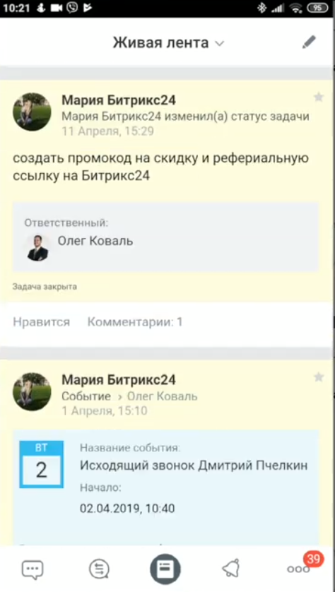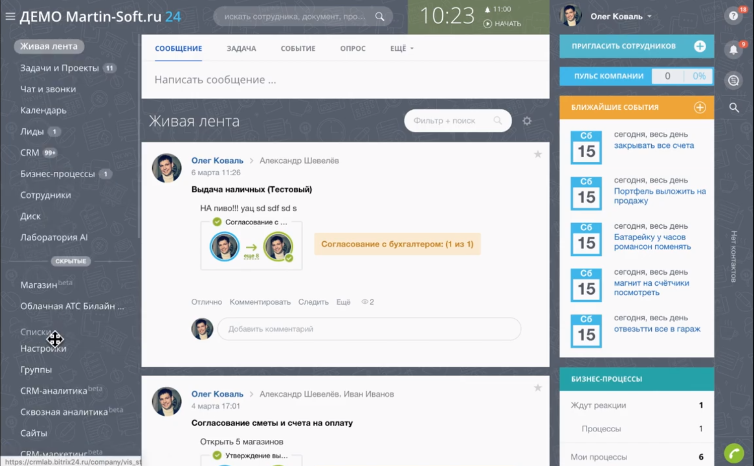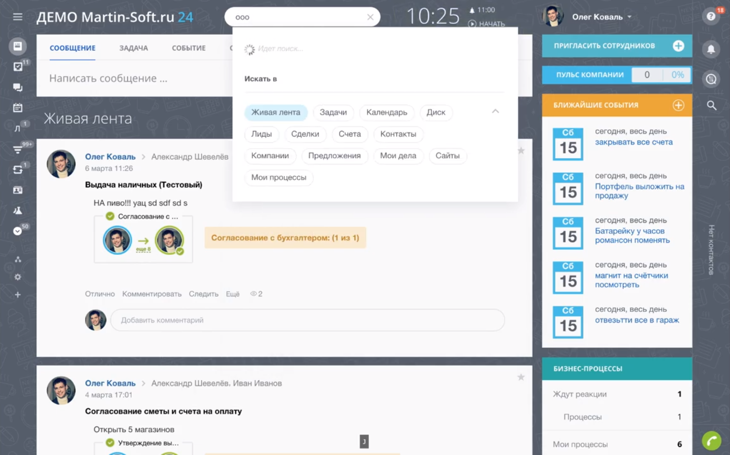 - Живая лента – новостной раздел, где отображаются все текущие задачи вашей компании. Постановка задач и их обсуждение происходит в режиме реального времени.