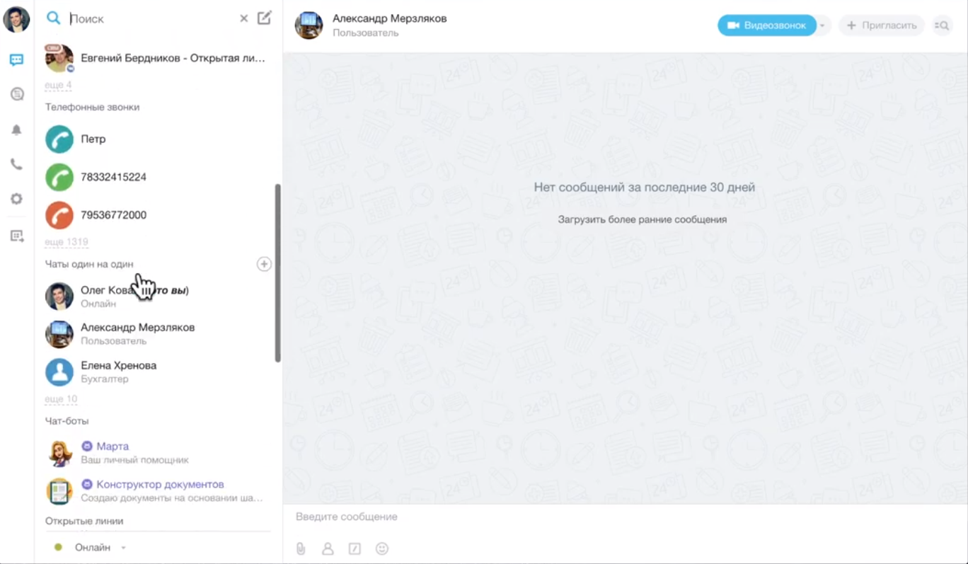 - Чат и звонки – раздел для коммуникации и связи. Инструментарий портала поддерживает возможность проведения внутренних звонков среди сотрудников, а также подключение контрагентов в единый чат.