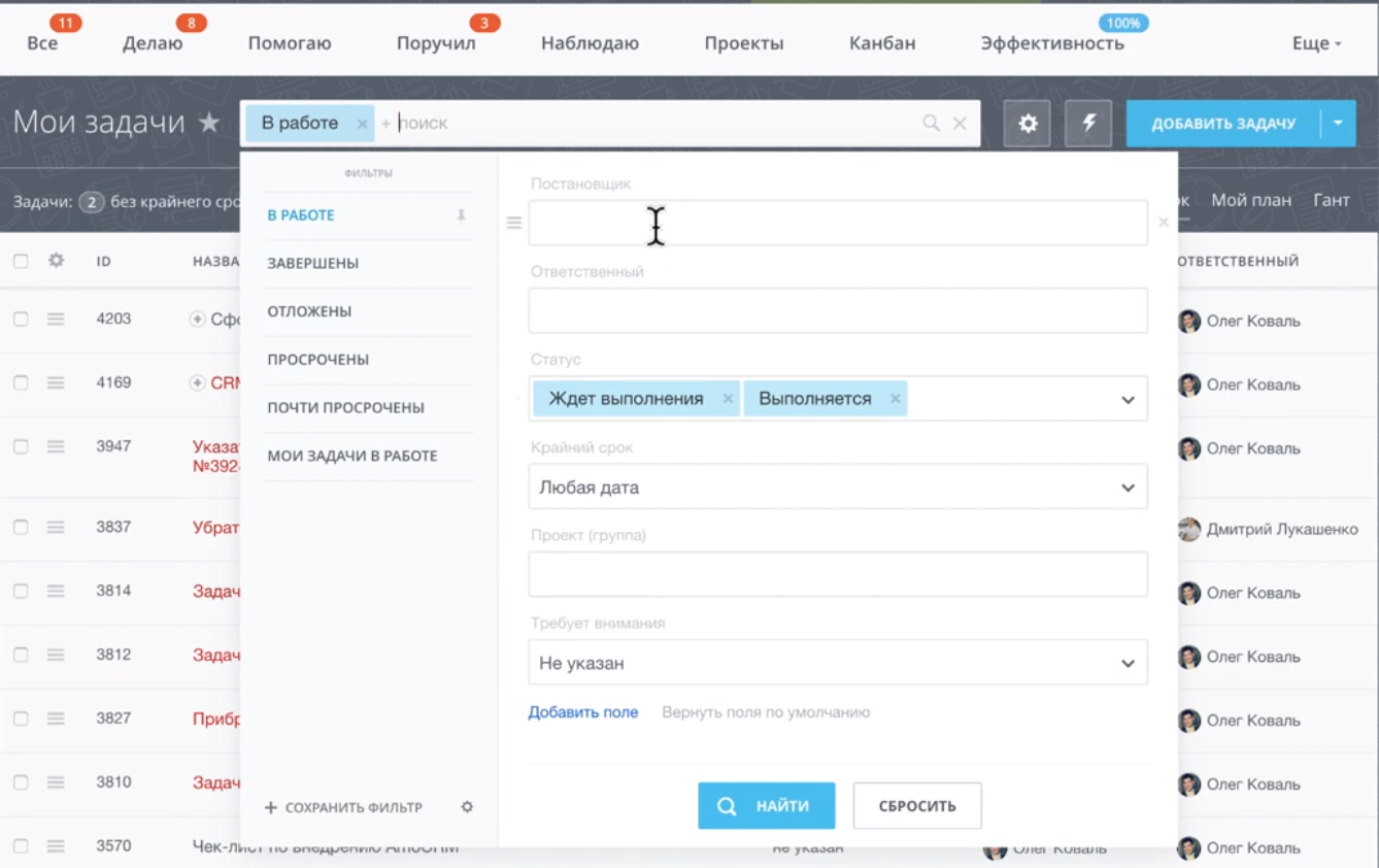 Выбирая которые можно отображать задачи, находящиеся в работе, задачи по которым вы выбраны соисполнителем, порученные вами задачи, задачи по которым вы назначены наблюдателем. Также есть возможно отфильтровать задачи по проектам, отобразить задачи в виде scrum-доски (Канбан).