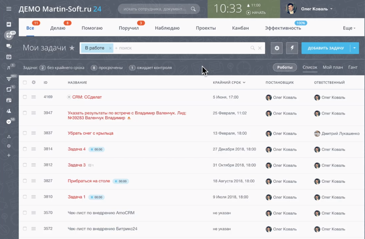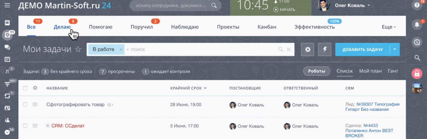 - Задачи – раздел, отображающий список, сроки и план задач. Интерфейс портала позволяет быстро создавать и редактировать задачи, а также коммуницировать с ответственными за проект сотрудниками.