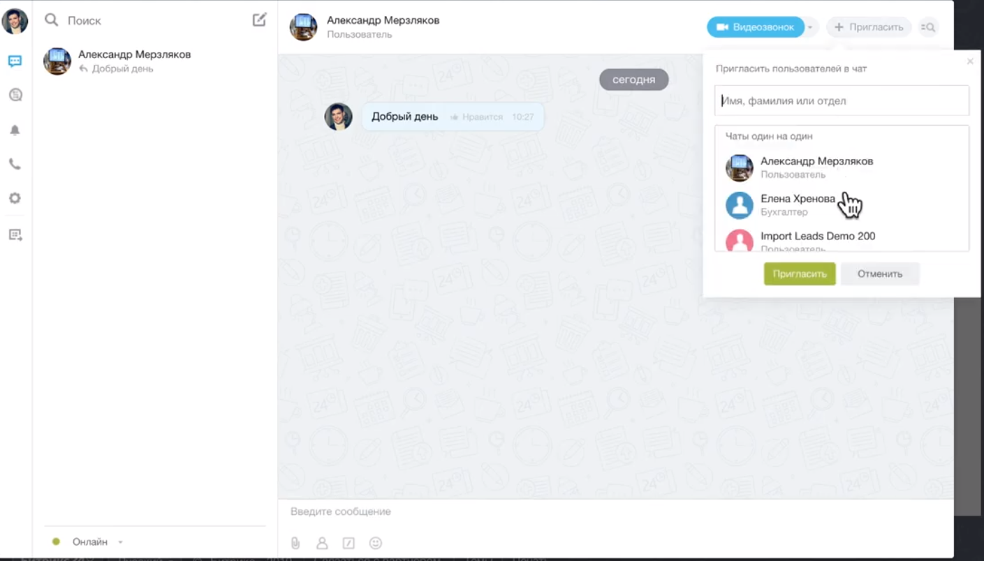 В чатах можно прикреплять файлы, использовать emoji. В чате есть возможность создать групповой чат — добавить сотрудников к чату. Для этого в правом верхнем углу чата нажмите кнопку «пригласить» и выберите необходимого сотрудника. После этого будет создан групповой чат, который можно переименовать (в верхней части чата).