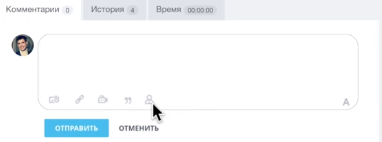 Также внизу окна задачи есть раздел «Комментарии» в котором можно оставлять комментарии к задаче. Комментарии можно добавлять адресованными конкретным сотрудникам. Для отправки комментария, адресованного конкретному сотруднику, нажмите соответствующую кнопку в форме добавления комментария и выберите сотрудника.