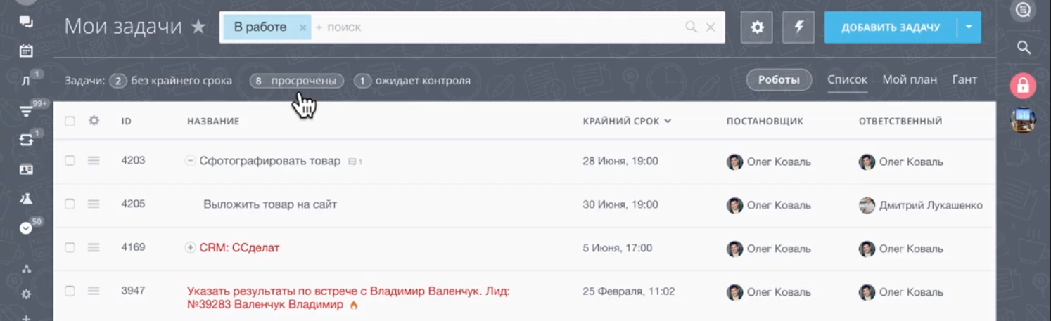 Над общим списком задач расположены быстрые фильтры, нажатием на которые можно отфильтровать список по различным параметрам.