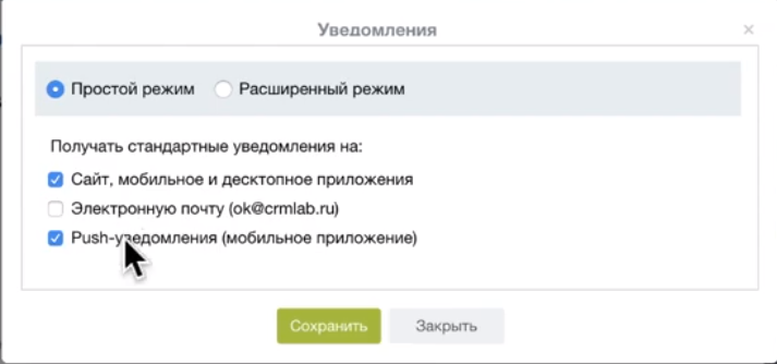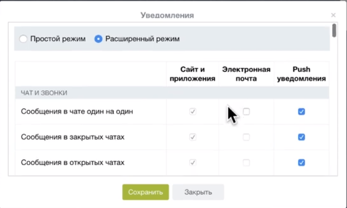 В окне настройки уведомлений есть 2 режима: простой и расширенный. В простом режиме устанавливается куда получать уведомления, например в мобильное приложение, приложение для компьютера, электронную почту или push-уведомления. В расширенном режиме можно детально настроить какую информацию и каким способом присылать в уведомлениях.