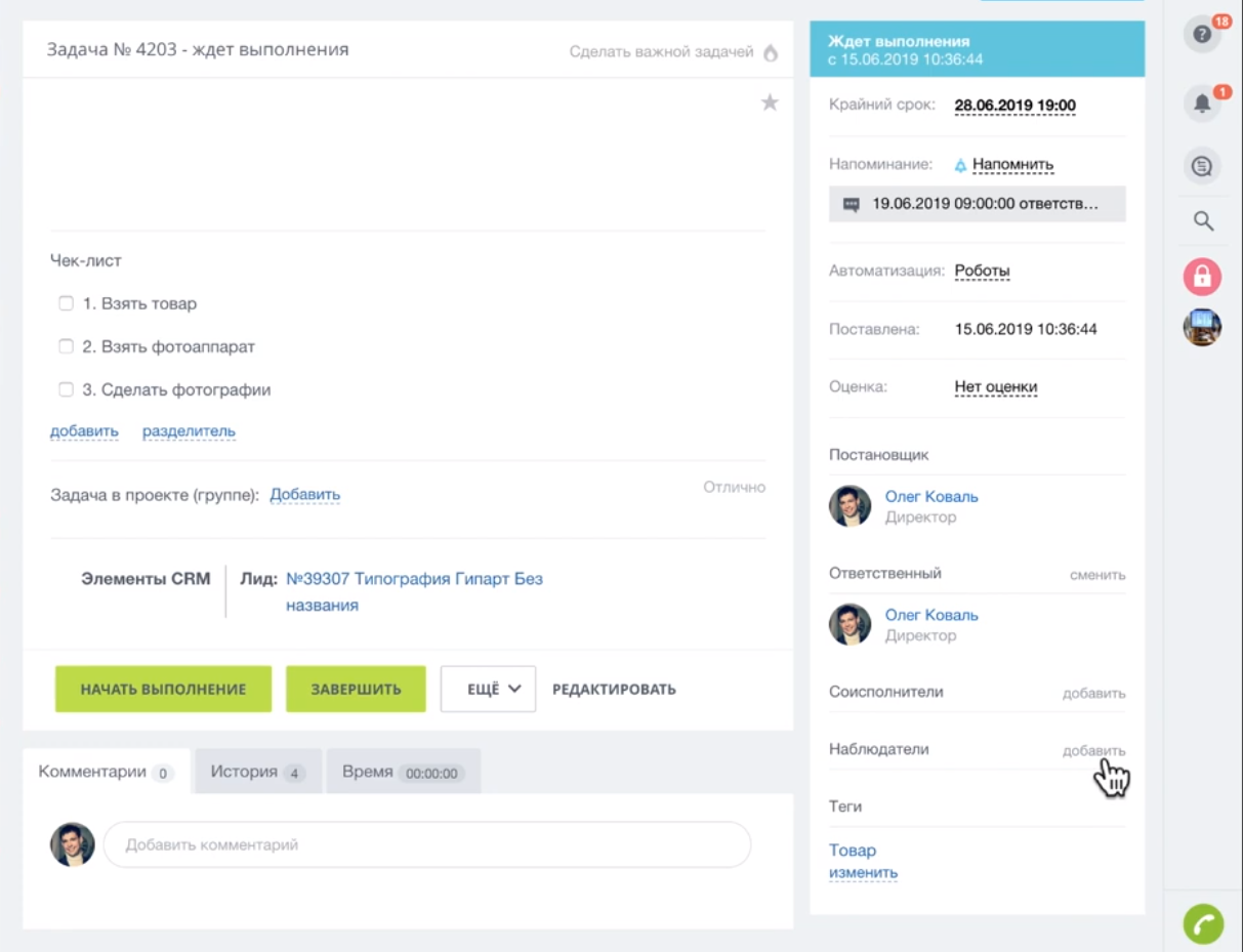 К поставленной задаче можно добавить наблюдателя. Для этого нажмите на задаче и в открывшемся окне справа выберите