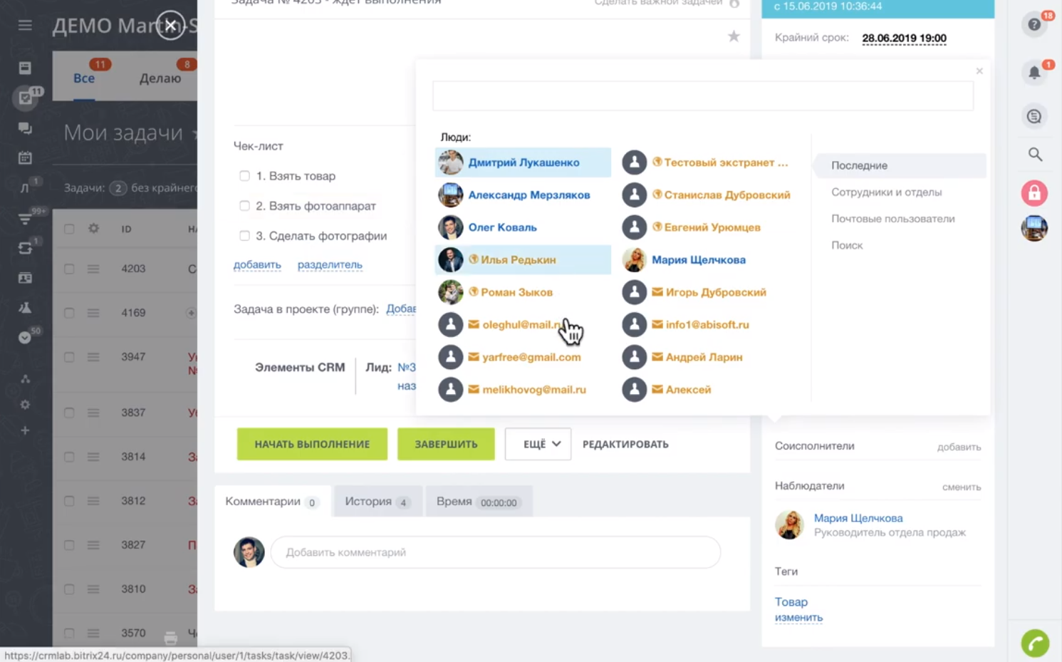 «Наблюдатели» — «добавить». В открывшемся окне выберите сотрудников-наблюдателей. Если необходимо добавить соисполнителей — перейдите «Соисполнители» — «добавить» и выберите сотрудников, которые будут принимать участие в исполнении задачи.