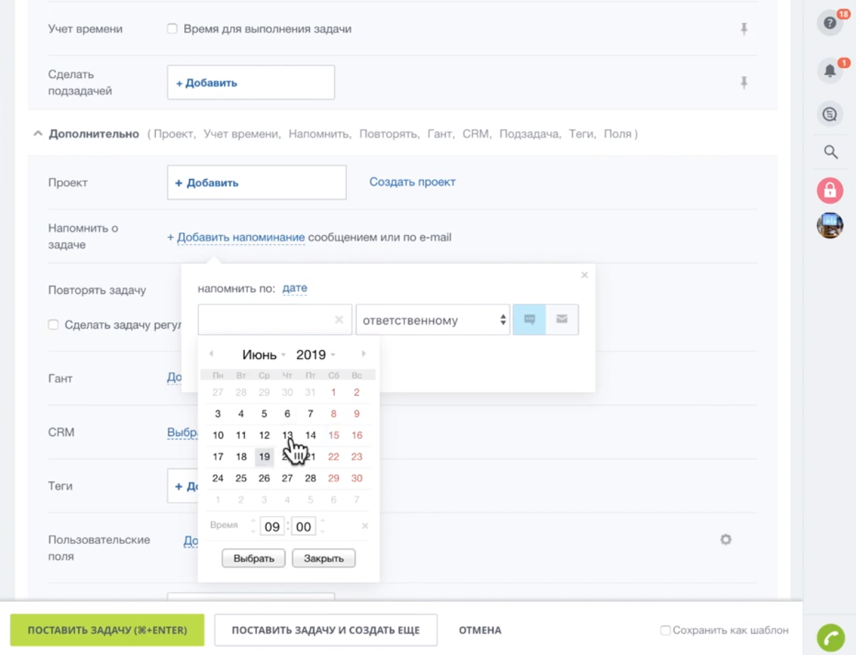 В открывшемся интерфейсе можно заполнить текст задачи, а также указать сроки выполнения и всех ответственных лиц. Для типовых задач из меню в верхнем углу можно создать шаблон, позволяющий сократить время заполнения задач.