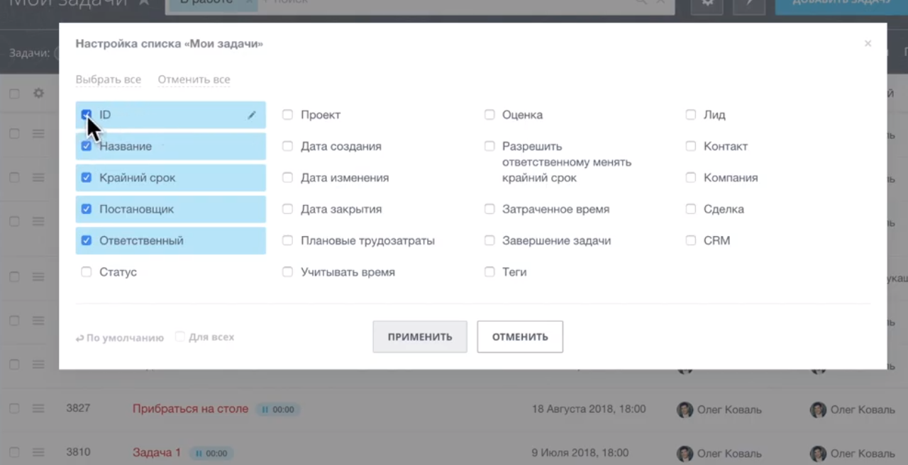 Существует возможность настроить отображение списка задач. Для этого необходимо нажать на иконку в виде шестеренки в левом верхнем углу списка задач и настроить необходимые параметры (добавлять и удалять столбцы для отображения).