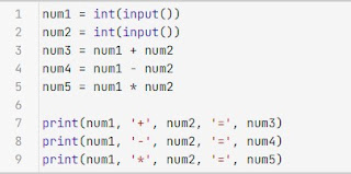 Программа должна вывести сумму, разность и произведение введённых чисел, каждое на отдельной строке.