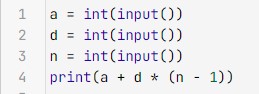 На вход программе подаётся три целых числа: a_1 a 1 , d d и n n , каждое на отдельной строке.