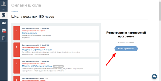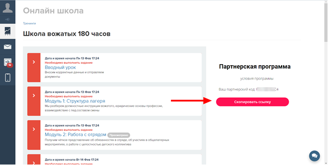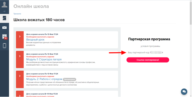 В нашей партнерской программе участвуют все образовательные курсы для вожатых, нет совершенно никаких ограничений по времени или количеству. Для того чтобы стать партнером нашей школы, достаточно выбрать соответствующую опцию в личном кабинете