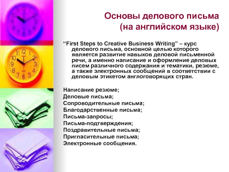 – курс делового письма, основной целью которого является развитие навыков деловой письменной речи, а именно написание и оформление деловых писем различного содержания и тематики, резюме, а также электронных сообщений в соответствии с деловым этикетом англоговорящих стран.
