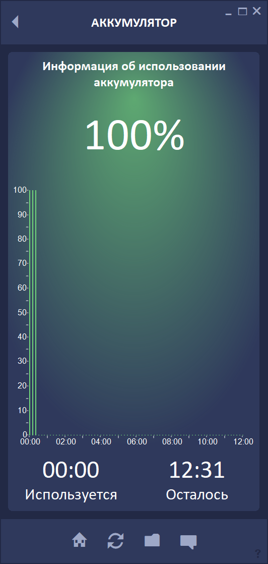 — Аккумулятор: отображает информацию о текущем заряде и оставшемся времени автономной работы.