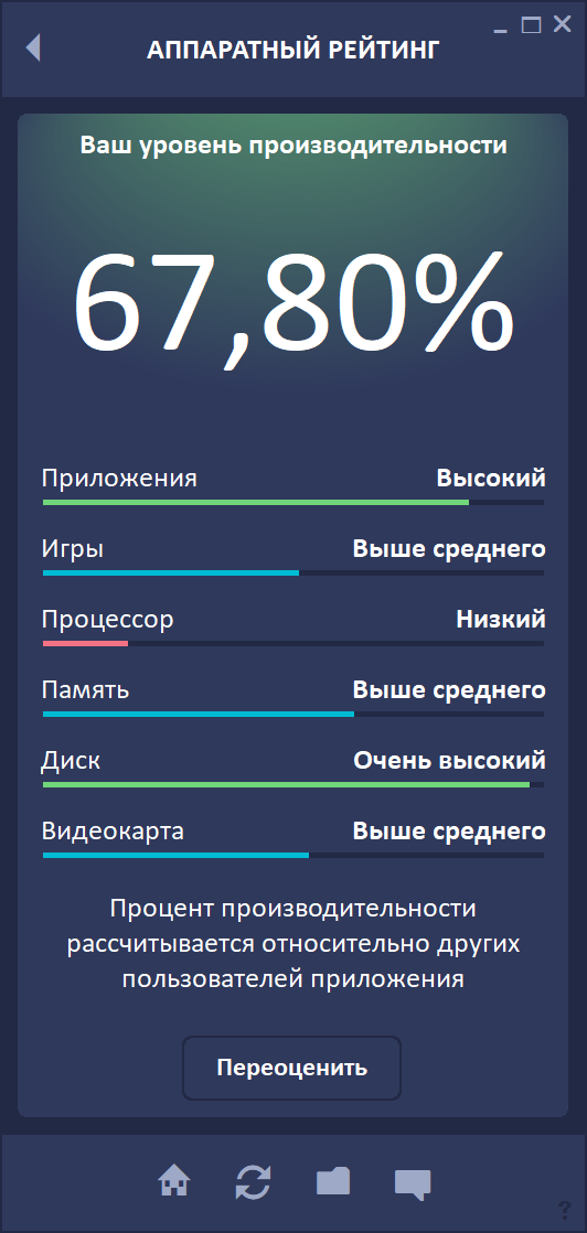 — Значение в процентах: отображает процент обобщенный процент производительности относительно других пользователей. Например, 70,45% означает, что компьютер быстрее чем 70,45% всех компьютеров, на которых установлено приложение, но слабее 29,55% остальных компьютеров на которых установлено приложение.