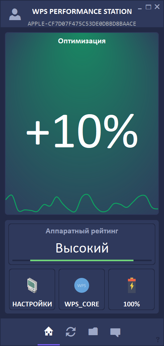— Оптимизация: отображает детальный статус по основным параметрам WPS. Рядом с названием раздела выводится текущий процент оптимизации ПК.