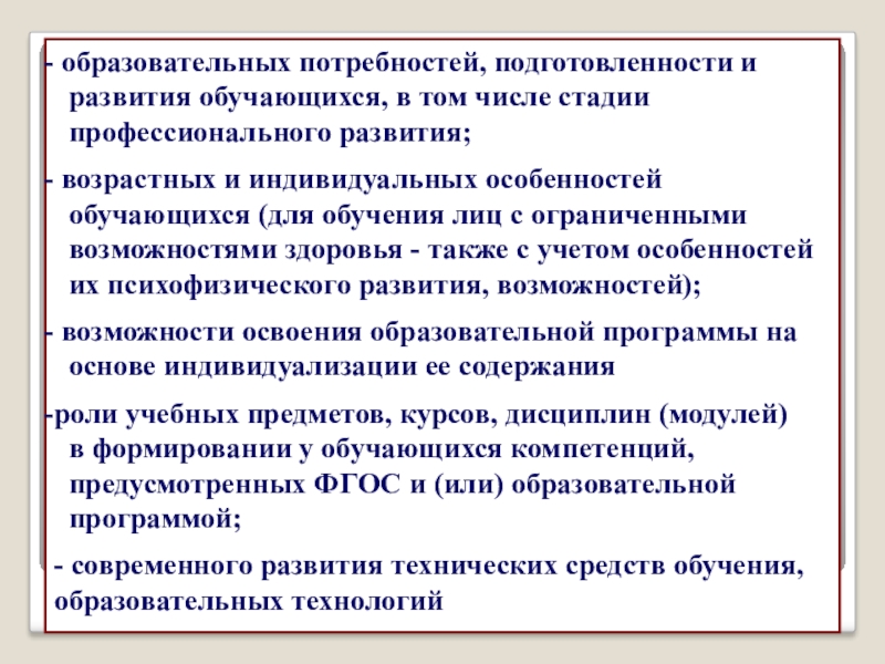 учетом необходимости обеспечения их практикоориентированности и (или) соответствия требованиям ФГОС СПО, роли в освоении профессиональной деятельности (учебного предмета, курса, дисциплины (модуля)), интересов и возможностей обучающихся (для преподавания по программам СПО)