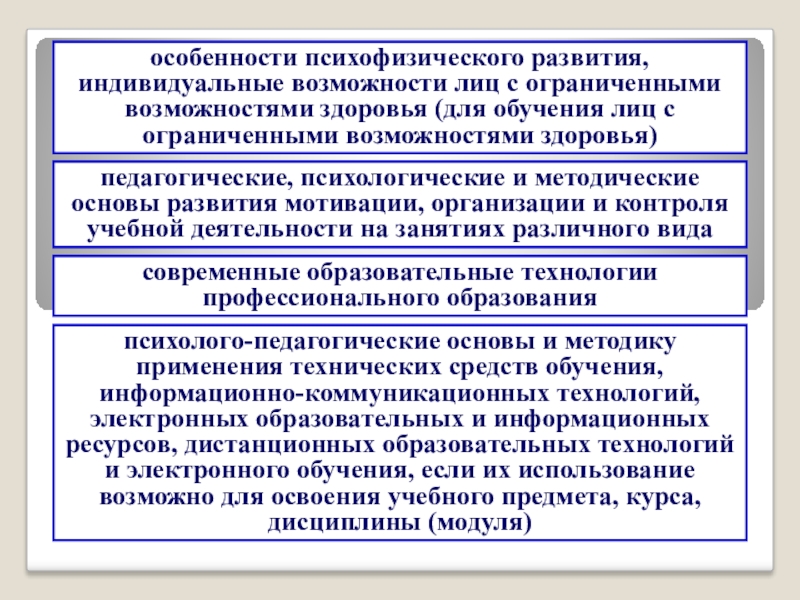 психолого-педагогические основы и методику применения технических средств обучения, информационно-коммуникационных технологий, электронных образовательных и информационных ресурсов, дистанционных образовательных технологий и электронного обучения, если их использование возможно для освоения учебного предмета, курса, дисциплины (модуля)