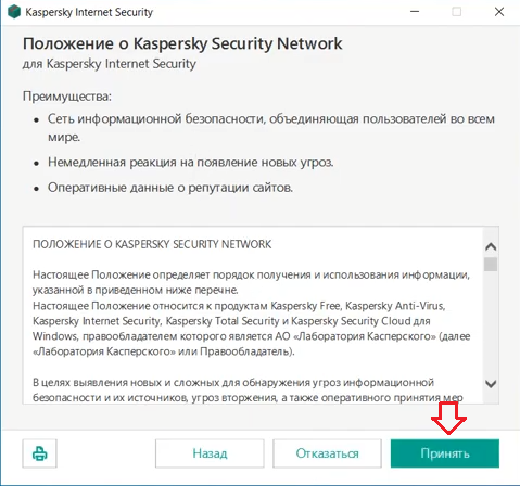 В пункте «Положение о Kaspersky Security Network», нажимаем «Принять»: