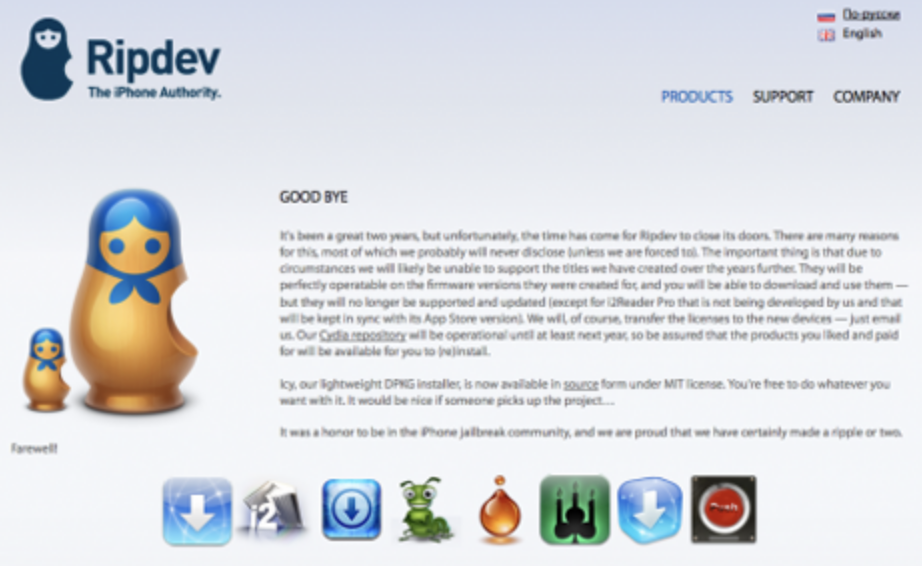 Козырев нашел ему iPhone 2G, Карпенко выпустил джейлбрейк спустя несколько дней. Сначала он был бесплатным, чуть позже команда начала принимать пожертвования на Яндекс.Деньгах, а затем разработчик Scorpios33 предложил команде Ripdev создать коммерческий пакет для русификации iPhone, соединив усилия с другими ребятами, например, Александром Ширинкиным (alexxb5), который занимался переводом системы.