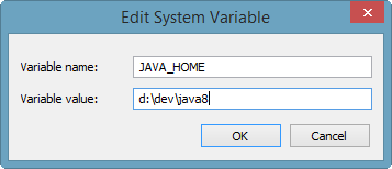 В нашем случае нужно создать системную переменную окружения JAVA_HOME и в значении указать путь, куда установлена JDK, у нас d:/dev/java8/