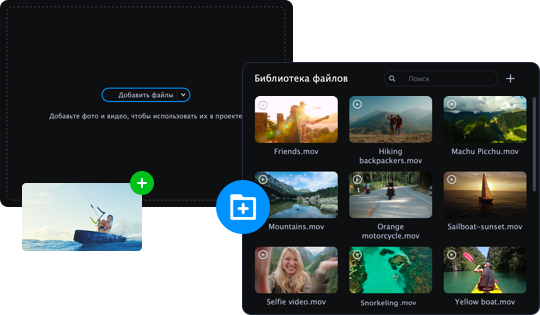 - Удобная работа с большими проектами – добавь видео и аудио в Библиотеку файлов, чтобы не искать их по разным папкам и дорожкам