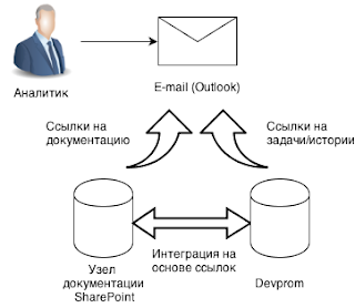 Аналитик работает с документацией на сервере SharePoint (либо через браузер, либо через приложение SharePoint Workspace). Ссылку на рабочий документ отправляет на e-mail коллегам. Если создана история/задача в Devprom, отправляется и ссылка на эту задачу. SharePoint и Devprom интегрированы между собой посредством ссылок.
