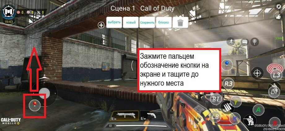 11. После выбора «Переключиться на сцену 1», на экране появится большое количество обозначений кнопок. Расставьте их на те места, где выполняются какие-либо действия в игре – прицел, атака, спринт, переключение оружия и т.п. Чтобы указать, где на экране располагается кнопка действия, нажмите на обозначение кнопки пальцем на экране, и тащите её по экрану до нужного места. Лишние кнопки Вы можете удалить. Для этого их необходимо перетащить на иконку корзины (мусорного ведра) в верхнем меню;