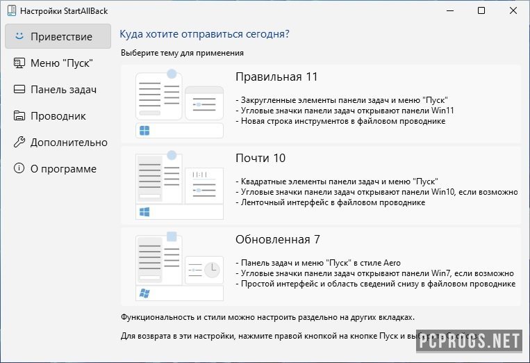 Для изменения оформления меню «Пуск» при помощи StartAllBack пользователю нужно лишь установить программу. Во вкладке «Приветствие» можно выбрать один из трех доступных стилей (Windows 7, 10 или 11), применяющихся одновременно к меню «Пуск» и «Панели задач». В остальных вкладках пользователь сможет внести более тонкие изменения для выбранного стиля, а также настроить функциональность меню «Пуск», «Панели задач» и «Проводника».