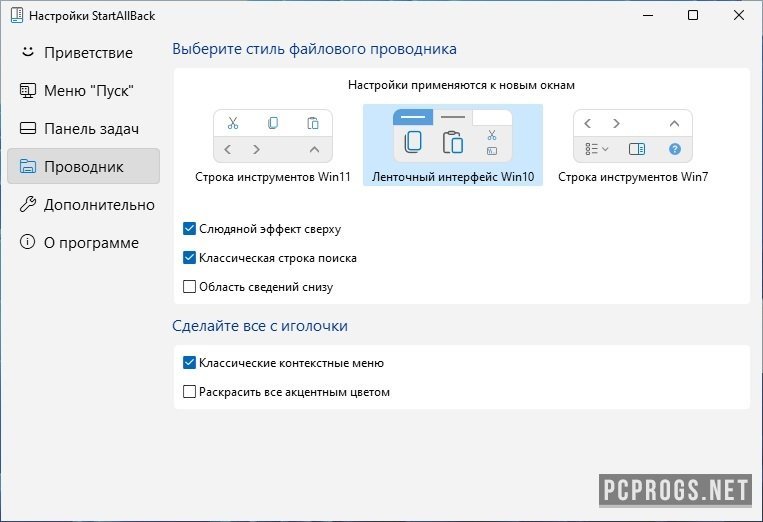 - Выбор одного из 3-х вариантов стилей для верхней части файлового менеджера «Проводник» (строка инструментов, как в Windows 7 или Windows 11, либо ленточный интерфейс, как в Windows 10).