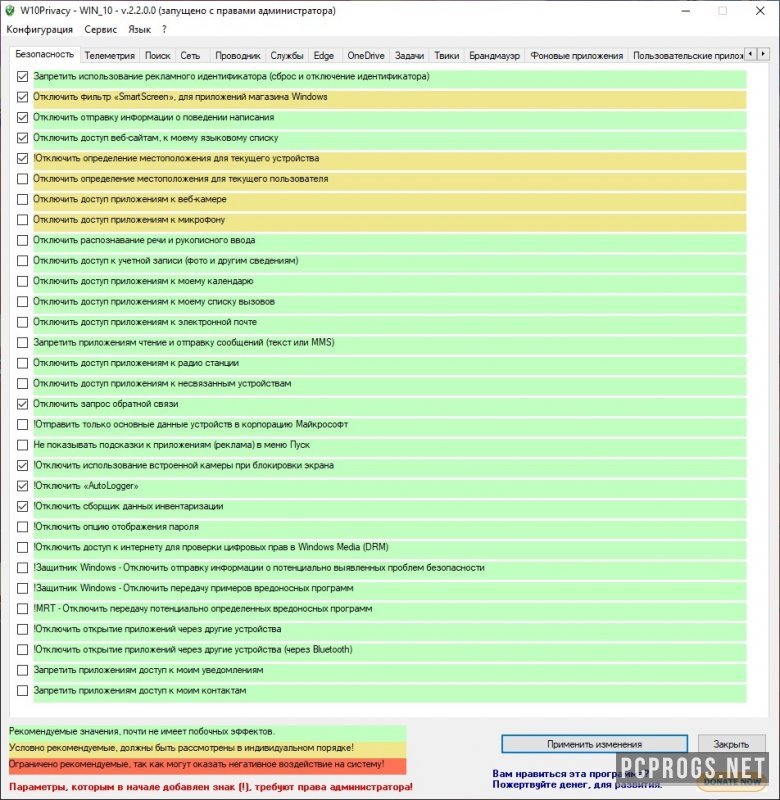 Рекомендации по использованию утилиты: всегда запускайте W10Privacy с правами администратора. Многие параметры требуют соответствующие права для изменения значений настроек. Кроме этого, с аккуратностью отключайте параметры выделенные красным цветом. После завершения настройки перезагрузите устройство.