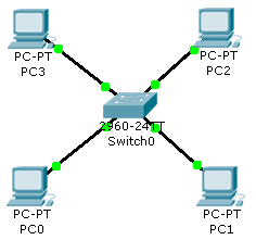 Если же у нас нет реального оборудования, то запускаем Cisco Packet Tracer и собираем в нем следующую топологию (При сборке учитываем, что PC 0 подключен к порту FasteEthernet 0/1, PC 1 к порту FasteEthernet 0/2 и т.д).